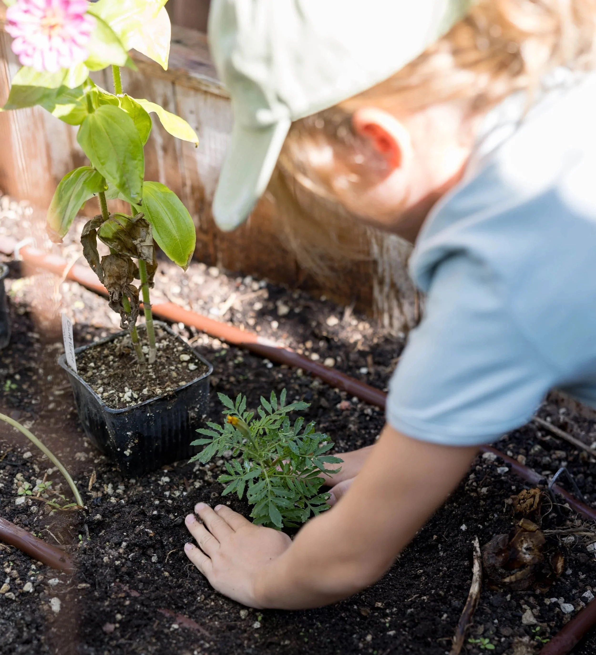 At Young Pioneers Farm School, children ages 3–10 learn in a 100% outdoor environment with covered areas for year-round comfort. As a true farm and nature school, our classrooms are the working farm, garden, and outdoor kitchen, where students care for animals, tend plants, and explore the nature. Our Farm School is located in San Diego County at Sand n Straw Community Farm.